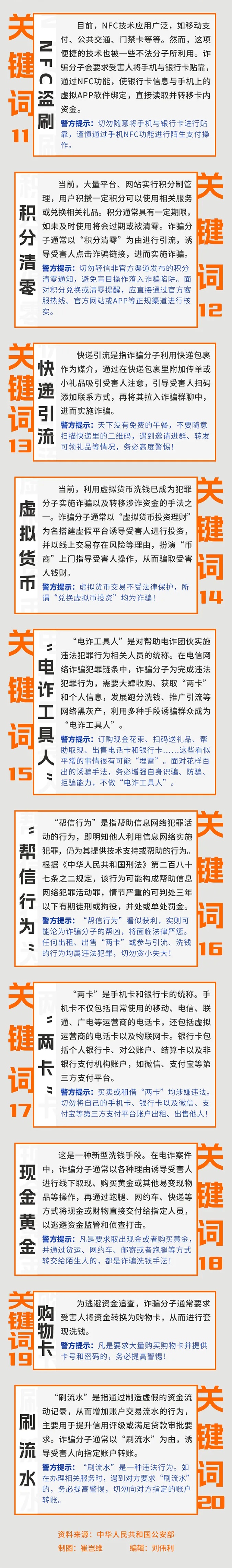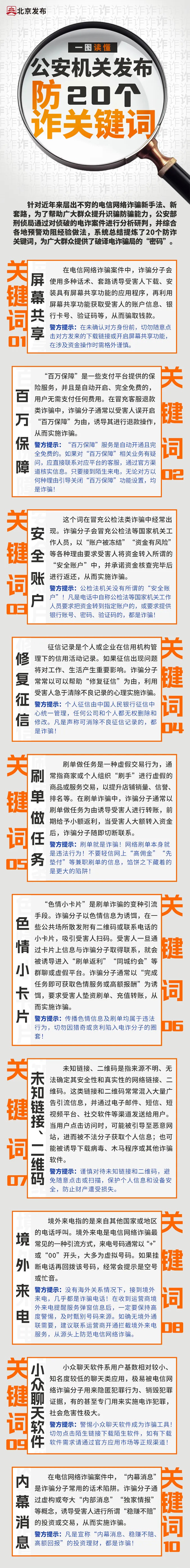 针对近年来层出不穷的电信网络诈骗新手法、新套路,为了帮助广大群众提升识骗防骗能力,公安部刑侦局通过对近期侦破的电诈案件进行分析研判,并综合各地预警劝阻经验做法,系统总结提炼了20个防诈关键词,为广大群众提供了破译电诈骗局的“密码”。